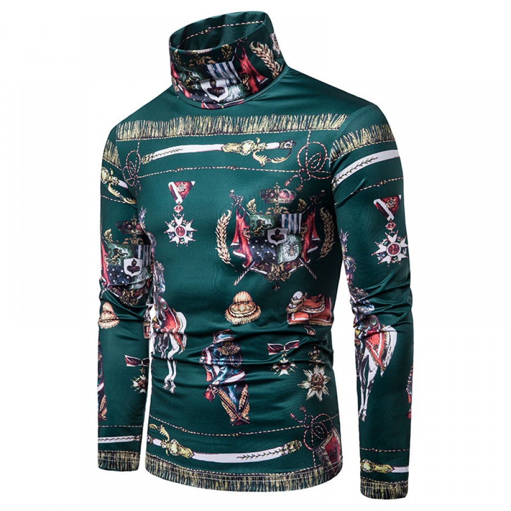 New Men's Large Size 3D Classical Green Pattern Printing High Neck Long Sleeve T-Shirt Bottoming Shirt